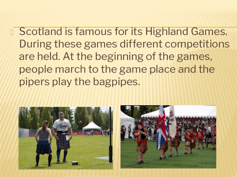 of mountains, lochs and offshore islands there. The most famous mountain is Ben Nevis, the highest peak of Scotland. The best know loch is Loch Ness.Ben Nevis