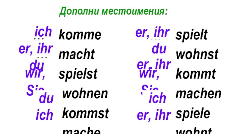 Дополни местоимения:icher, ihrduwir, Sieduicher, ihrduer, ihrwir, Sieicher, ihr