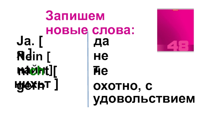 Ja. [ я ]даЗапишем новые слова:Nein [ найн ]gernнет nicht [ нихьт ]неохотно, с удовольствием