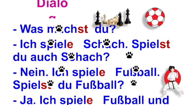 Dialog- Was machst du?- Ich spiele  Schach. Spielst du auch Schach?- Nein. Ich spiele  Fußball.