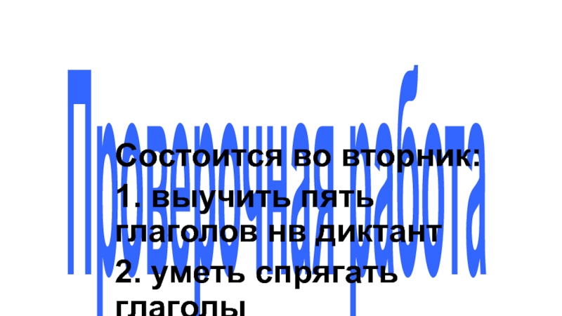 Проверочная работа Состоится во вторник:1. выучить пять глаголов нв диктант2. уметь спрягать глаголы