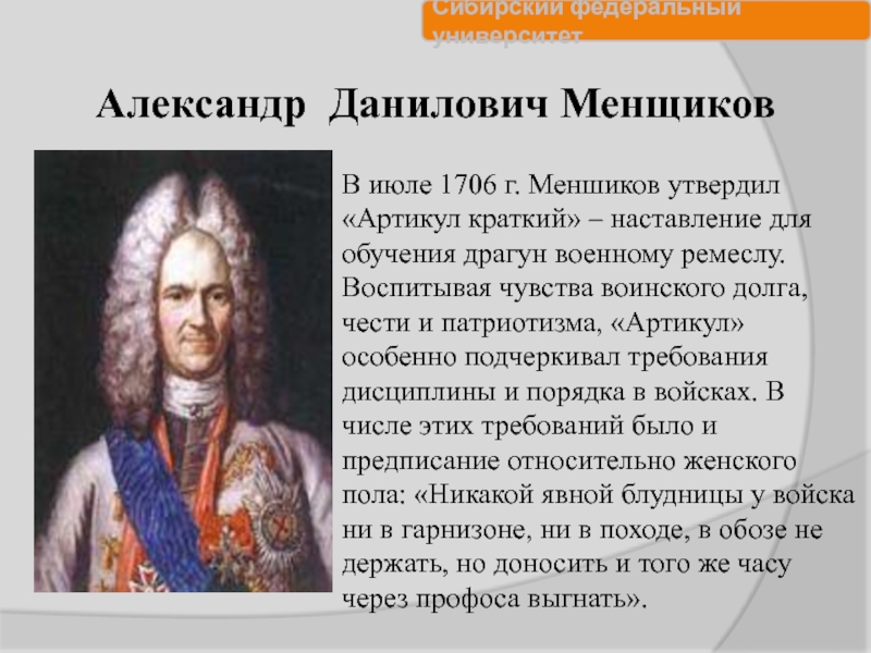 воинского долга, чести и патриотизма, «Артикул» особенно подчеркивал требования дисциплины и порядка в войсках. В числе этих требований было и предписание относительно женского пола: «Никакой явной блудницы у войска ни в гарнизоне, ни в походе, в обозе не держать, но доносить и того же часу через профоса выгнать».