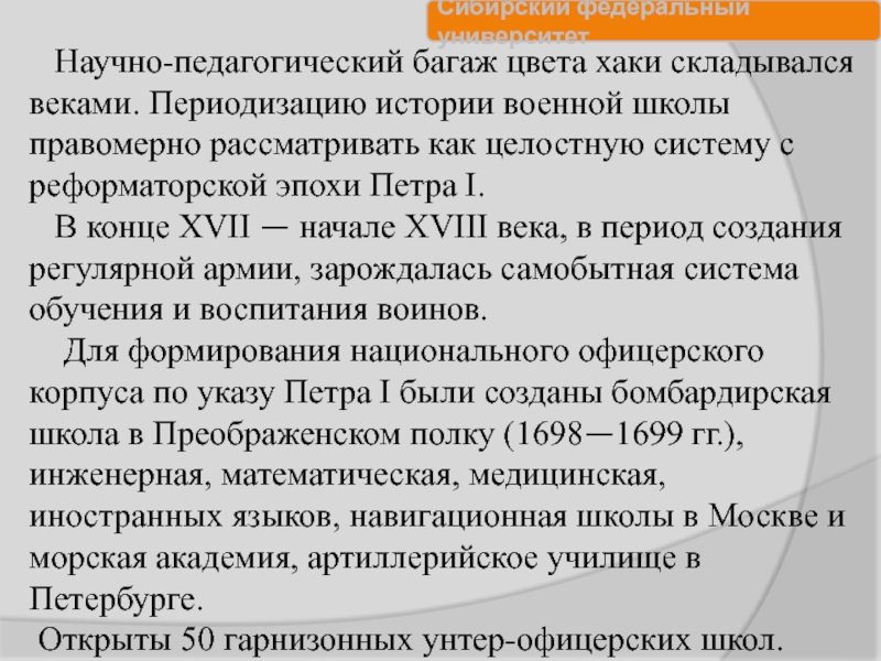 Научно-педагогический багаж цвета хаки складывался веками. Периодизацию