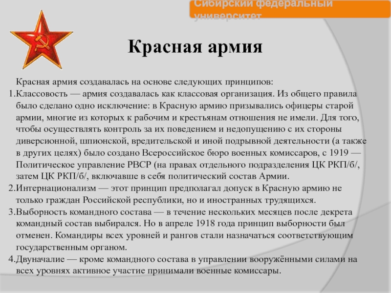 Интернационализм — этот принцип предполагал допуск в Красную армию не только граждан Российской республики, но и иностранных трудящихся.