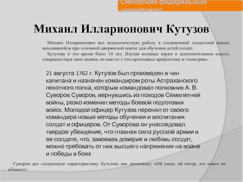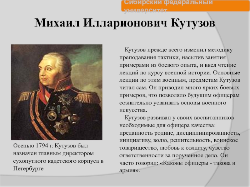 спустя полвека, уже в эпоху наполеоновских войн. Под его началом выросла целая плеяда знаменитых русских полководцев, включая Суворова и Кутузова.