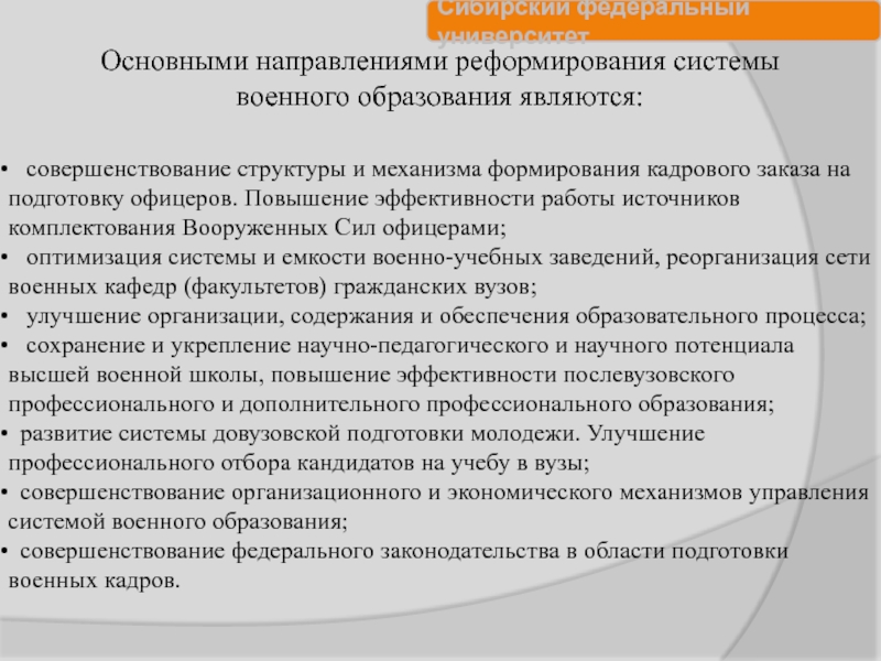 Слайд 58Основными направлениями реформирования системы военного образования являются: