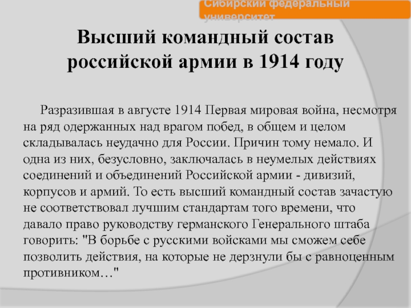 врагом побед, в общем и целом складывалась неудачно для России. Причин тому немало. И одна из них, безусловно, заключалась в неумелых действиях соединений и объединений Российской армии - дивизий, корпусов и армий. То есть высший командный состав зачастую не соответствовал лучшим стандартам того времени, что давало право руководству германского Генерального штаба говорить: "В борьбе с русскими войсками мы сможем себе позволить действия, на которые не дерзнули бы с равноценным противником…"