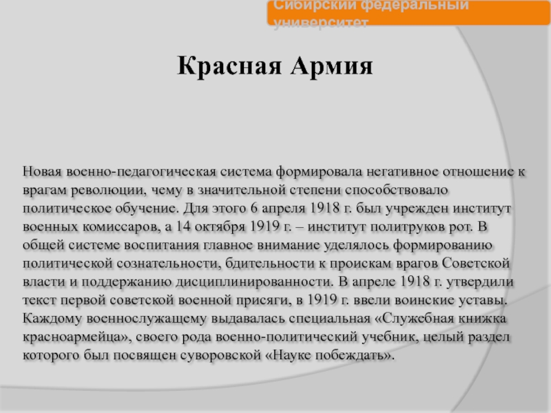1918 г. был учрежден институт военных комиссаров, а 14 октября 1919 г. – институт политруков рот. В общей системе воспитания главное внимание уделялось формированию политической сознательности, бдительности к проискам врагов Советской власти и поддержанию дисциплинированности. В апреле 1918 г. утвердили текст первой советской военной присяги, в 1919 г. ввели воинские уставы. Каждому военнослужащему выдавалась специальная «Служебная книжка красноармейца», своего рода военно-политический учебник, целый раздел которого был посвящен суворовской «Науке побеждать».