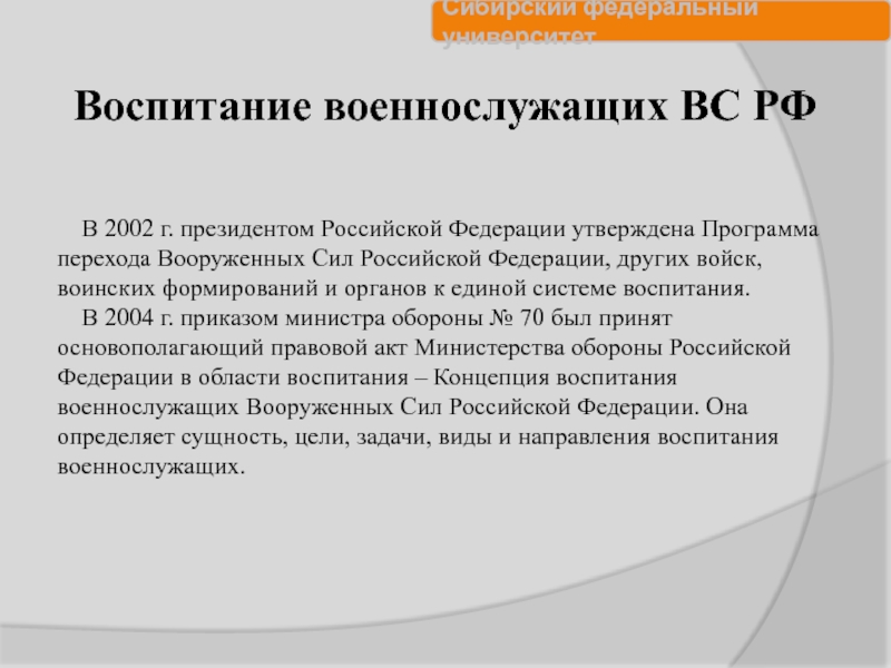 В 2004 г. приказом министра обороны № 70 был принят основополагающий правовой акт Министерства обороны Российской Федерации в области воспитания – Концепция воспитания военнослужащих Вооруженных Сил Российской Федерации. Она определяет сущность, цели, задачи, виды и направления воспитания военнослужащих.