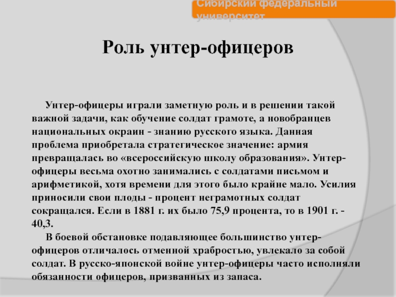 - знанию русского языка. Данная проблема приобретала стратегическое значение: армия превращалась во «всероссийскую школу образования». Унтер-офицеры весьма охотно занимались с солдатами письмом и арифметикой, хотя времени для этого было крайне мало. Усилия приносили свои плоды - процент неграмотных солдат сокращался. Если в 1881 г. их было 75,9 процента, то в 1901 г. - 40,3.