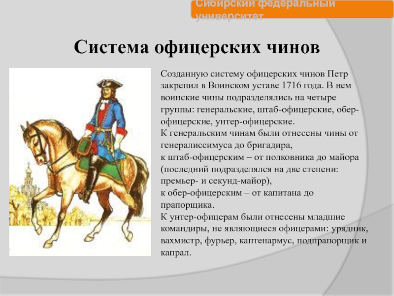 Воинском уставе 1716 года. В нем воинские чины подразделялись на