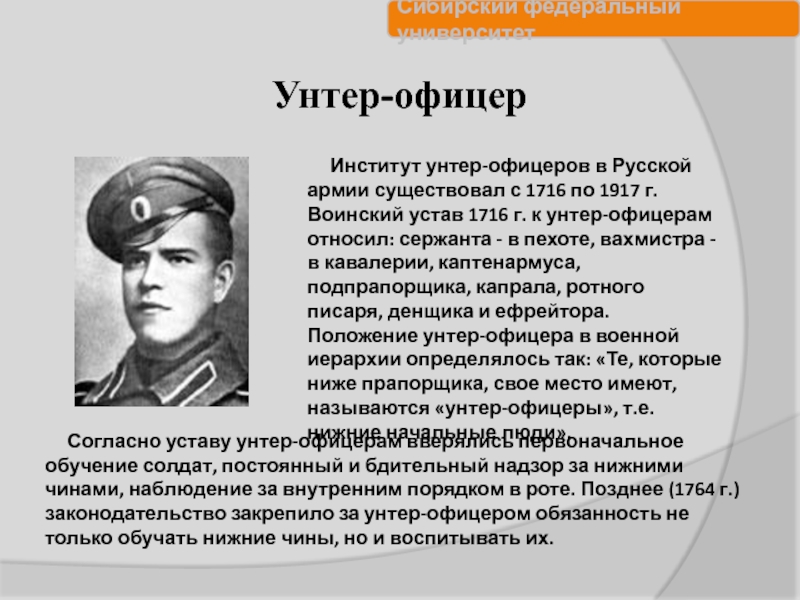 в пехоте, вахмистра - в кавалерии, каптенармуса, подпрапорщика, капрала, ротного писаря, денщика и ефрейтора. Положение унтер-офицера в военной иерархии определялось так: «Те, которые ниже прапорщика, свое место имеют, называются «унтер-офицеры», т.е. нижние начальные люди».