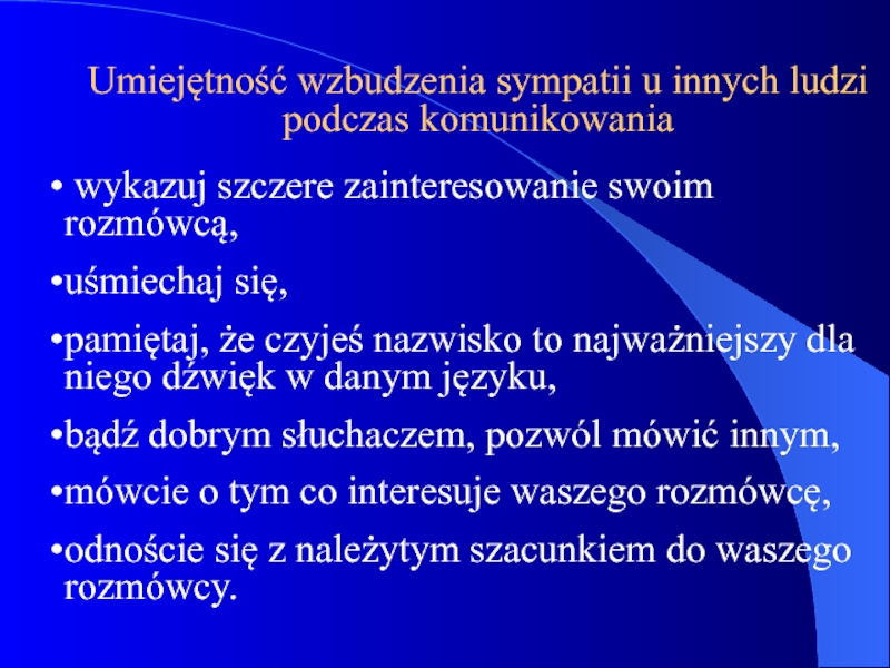 Слайд 13Umiejętność wzbudzenia sympatii u innych ludzi podczas komunikowania