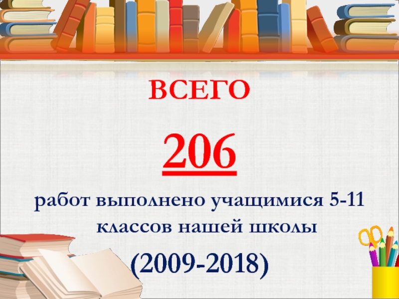 ВСЕГО206 работ выполнено учащимися 5-11 классов нашей школы(2009-2018)