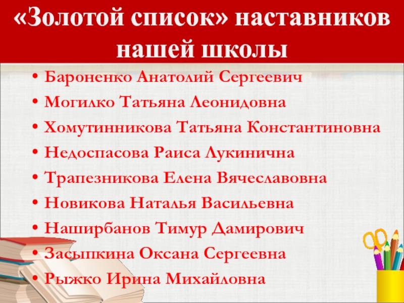 «Золотой список» наставников нашей школыБароненко Анатолий СергеевичМогилко Татьяна ЛеонидовнаХомутинникова Татьяна КонстантиновнаНедоспасова Раиса ЛукиничнаТрапезникова Елена ВячеславовнаНовикова Наталья ВасильевнаНаширбанов