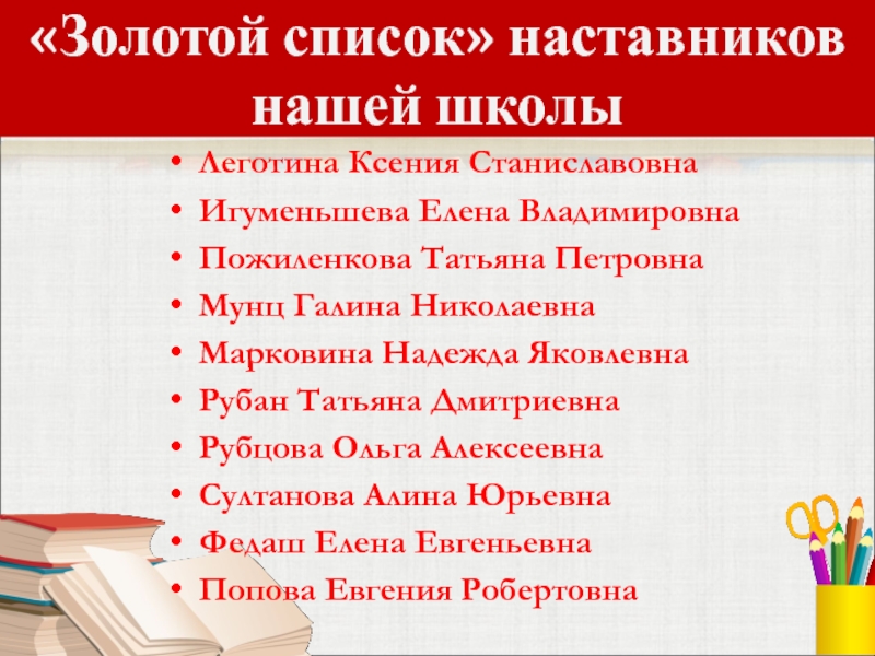 «Золотой список» наставников нашей школыЛеготина Ксения СтаниславовнаИгуменьшева Елена ВладимировнаПожиленкова Татьяна ПетровнаМунц Галина НиколаевнаМарковина Надежда ЯковлевнаРубан Татьяна ДмитриевнаРубцова