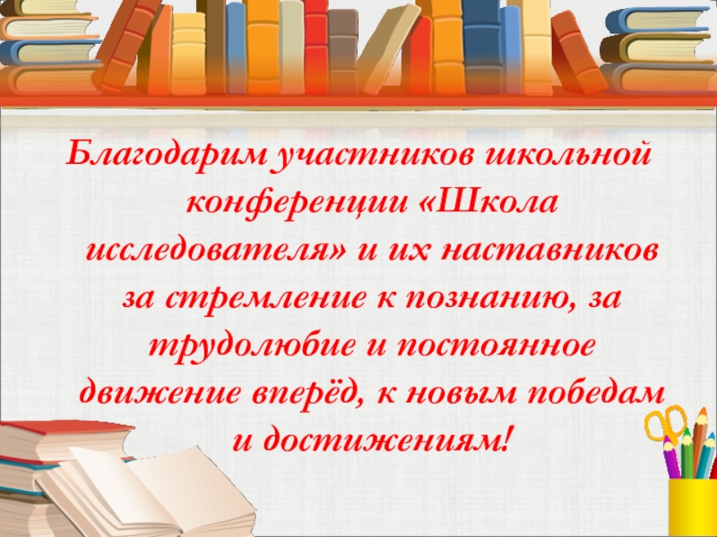 Благодарим участников школьной конференции «Школа исследователя» и их наставников за стремление к познанию, за трудолюбие и постоянное