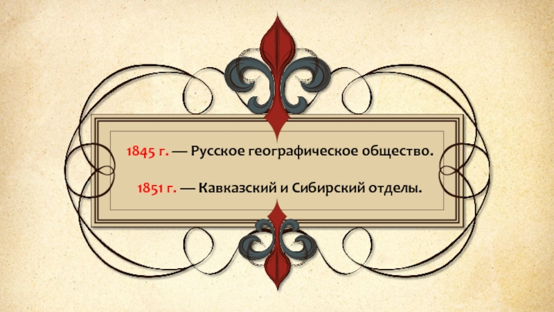 1845 г. — Русское географическое общество.1851 г. — Кавказский и Сибирский отделы.