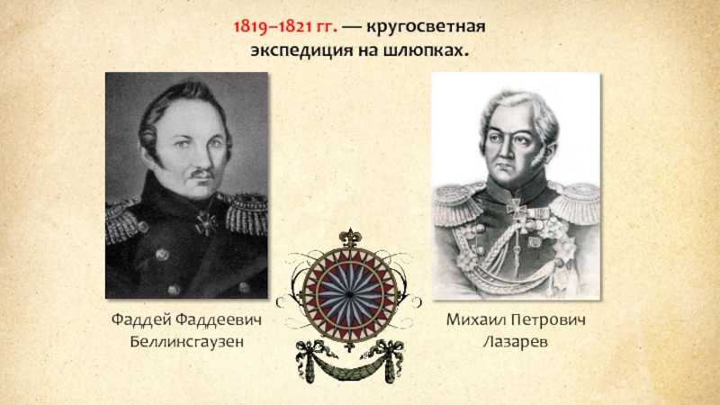 1819–1821 гг. — кругосветная экспедиция на шлюпках.Фаддей Фаддеевич БеллинсгаузенМихаил Петрович Лазарев