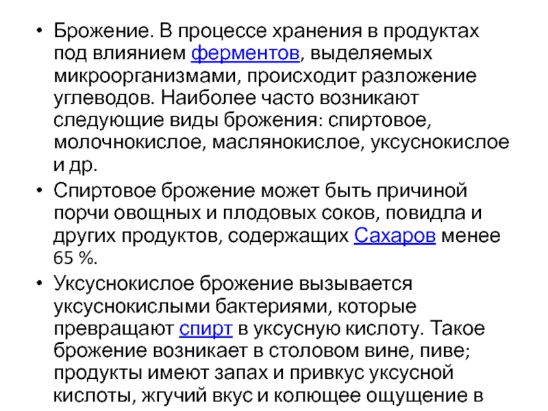 Слайд 6Брожение. В процессе хранения в продуктах под влиянием ферментов, выделяемых микроорганизмами,