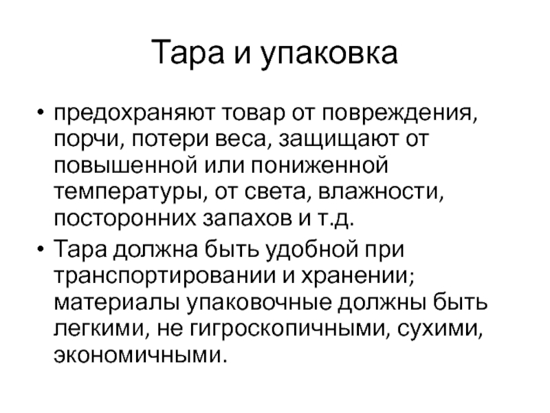 Тара должна быть удобной при транспортировании и хранении; материалы упаковочные должны быть легкими, не гигроскопичными, сухими, экономичными.