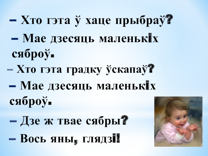 – Мае дзесяць маленькiх сяброў.– Хто гэта градку ўскапаў?– Мае дзесяць маленькiх сяброў.– Дзе ж твае сябры?–
