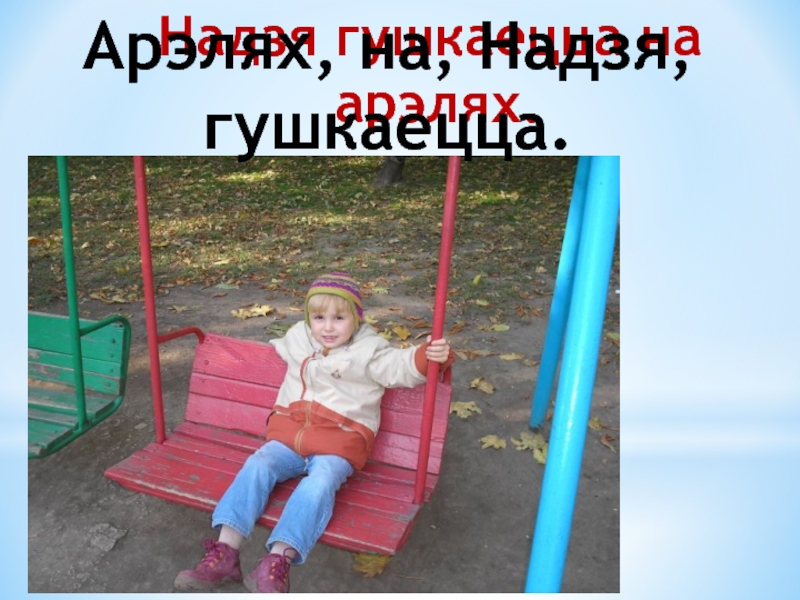 Надзя гушкаецца на арэлях.Арэлях, на, Надзя, гушкаецца.