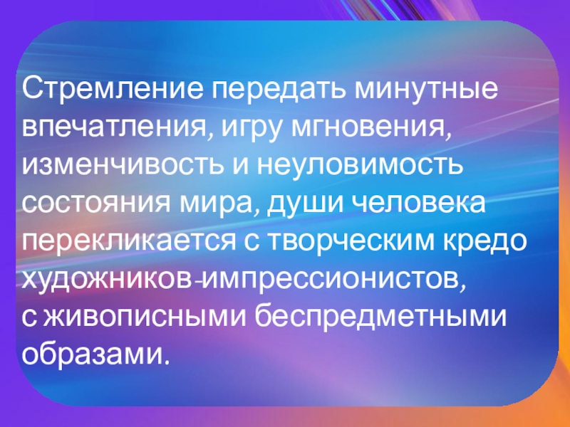 Слайд 5Стремление передать минутные впечатления, игру мгновения, изменчивость и неуловимость состояния