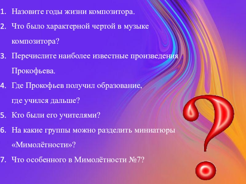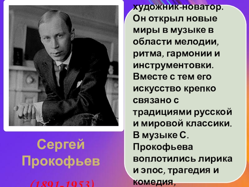 мелодии, ритма, гармонии и инструментовки. Вместе с тем его искусство крепко связано с традициями русской и мировой классики. В музыке С. Прокофьева воплотились лирика и эпос, трагедия и комедия, человеческое горе и радость, смех и слёзы.