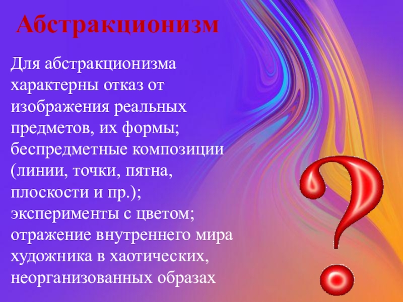 Слайд 16Для абстракционизма характерны отказ от изображения реальных предметов, их формы;