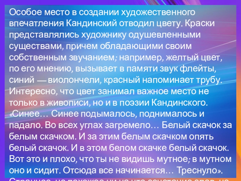 желтый цвет, по его мнению, вызывает в памяти звук флейты, синий — виолончели, красный напоминает трубу. Интересно, что цвет занимал важное место не только в живописи, но и в поэзии Кандинского. «Синее… Синее подымалось, поднималось и падало. Во всех углах загремело… Белый скачок за белым скачком. И за этим белым скачком опять белый скачок. И в этом белом скачке белый скачок. Вот это и плохо, что ты не видишь мутное; в мутном оно и сидит. Отсюда все начинается… Треснуло». Странное, не похожее ни на что сочетание слов, но, наверное, только так и можно описать вербально картины Кандинского.