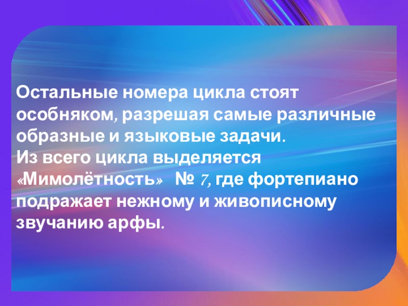 Слайд 9Остальные номера цикла стоят особняком, разрешая самые различные образные и