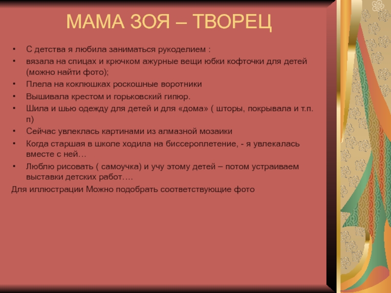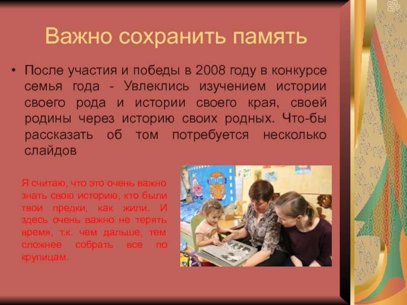 Я считаю, что это очень важно знать свою историю, кто были твои предки, как жили. И здесь очень важно не терять время, т.к. чем дальше, тем сложнее собрать все по крупицам.