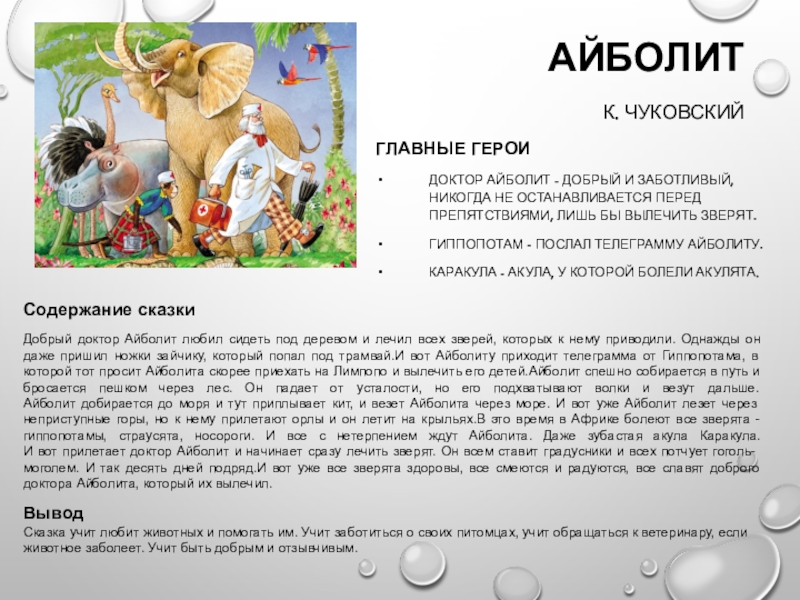 Добрый доктор Айболит любил сидеть под деревом и лечил всех зверей, которых к нему приводили. Однажды он даже пришил ножки зайчику, который попал под трамвай.И вот Айболиту приходит телеграмма от Гиппопотама, в которой тот просит Айболита скорее приехать на Лимпопо и вылечить его детей.Айболит спешно собирается в путь и бросается пешком через лес. Он падает от усталости, но его подхватывают волки и везут дальше.