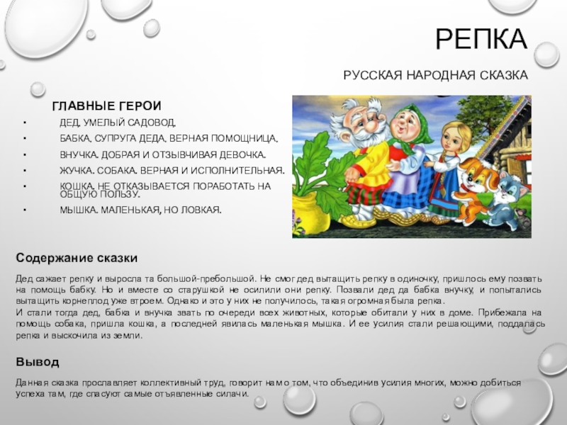 Дед сажает репку и выросла та большой-пребольшой. Не смог дед вытащить репку в одиночку, пришлось ему позвать на помощь бабку. Но и вместе со старушкой не осилили они репку. Позвали дед да бабка внучку, и попытались вытащить корнеплод уже втроем. Однако и это у них не получилось, такая огромная была репка.
