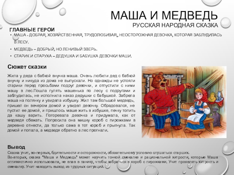 Во-вторых, сказка "Маша и Медведь" может научить тонкой смекалке и рациональной хитрости, которые Маша оптимистично использовала, не впав в панику, чтобы забраться в короб с пирожками. Учит проявлять хитрость и смекалку. Учит находить выход из трудных ситуаций.