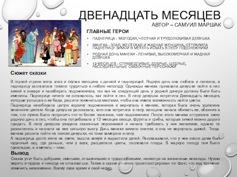 В горной стране жила злая и скупая женщина с дочкой и падчерицей. Родную дочь она любила и лелеяла, а падчерицу заставляла тяжело трудиться в любую непогоду. Однажды мачеха приказала девушке пойти в лес зимой в январе и насобирать подснежников, так как на следующий день у родной дочери должны были быть именины. Падчерице ничего не оставалось, как пойти в лес. В лесу девушка встретила Двенадцать месяцев, которые услышав о ее беде, решили поменяться местами, чтобы она имела возможность найти цветы.