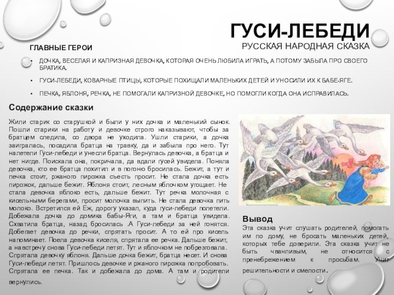 Жили старик со старушкой и были у них дочка и маленький сынок. Пошли старики на работу и девочке строго наказывают, чтобы за братцем следила, со двора не уходила. Ушли старики, а дочка заигралась, посадила братца на травку, да и забыла про него. Тут налетели Гуси-лебеди и унесли братца. Вернулась девочка, а братца и нет нигде. Поискала она, покричала, да вдали гусей увидела. Поняла девочка, кто ее братца похитил и в погоню бросилась. Бежит, а тут и печка стоит, ржаного пирожка съесть просит. Не стала дочка есть пирожок, дальше бежит. Яблоня стоит, лесным яблочком угощает. Не стала девочка яблоко есть, дальше бежит. Тут речка молочная с кисельными берегами, просит молочка выпить. Не стала девочка пить молоко. Встретился ей Еж, дорогу указал, куда гуси-лебеди полетели. Добежала дочка до домика бабы-Яги, а там и братца увидела. Схватила братца, назад бросилась .А Гуси-лебеди за ней гонятся. Добегает девочка до речки, спрятать просит. А то ей про кисель напоминает. Поела девочка киселя, спрятала ее речка. Дальше бежит, а навстречу снова Гуси-лебеди летят. Тут и яблочком не побрезговала. Спрятала девочку яблоня. Дальше дочка бежит, братца несет. И снова Гуси-лебеди летят. Пришлось девочке и ржаного пирожка попробовать. Спрятала ее печка. Так и добежала до дома. А там и родители вернулись.