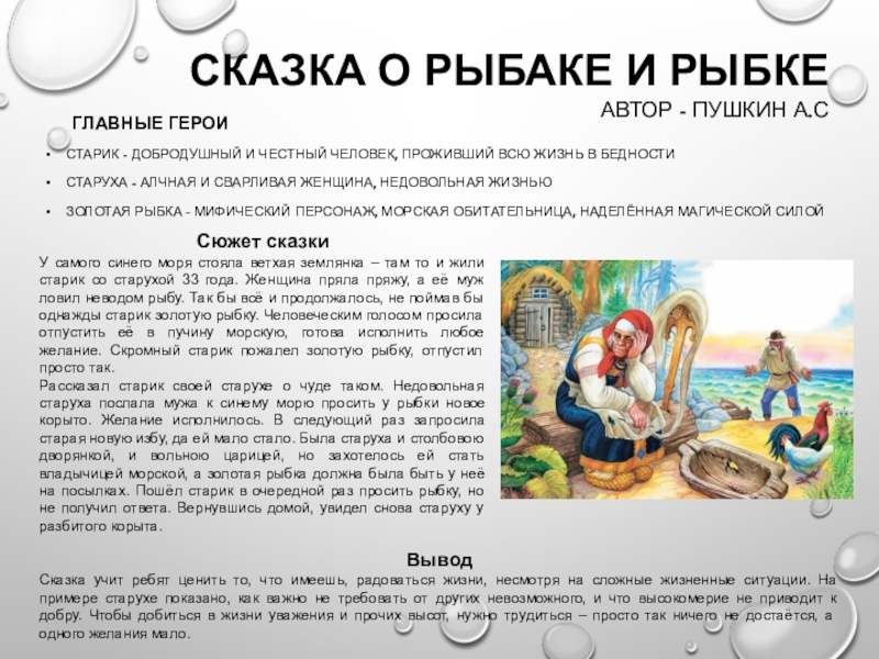 У самого синего моря стояла ветхая землянка – там то и жили старик со старухой 33 года. Женщина пряла пряжу, а её муж ловил неводом рыбу. Так бы всё и продолжалось, не поймав бы однажды старик золотую рыбку. Человеческим голосом просила отпустить её в пучину морскую, готова исполнить любое желание. Скромный старик пожалел золотую рыбку, отпустил просто так.