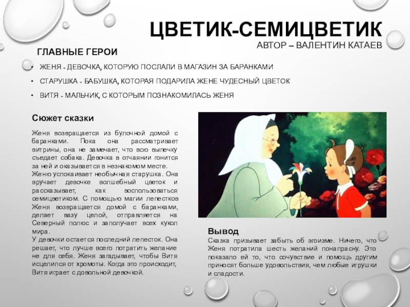 Сказка призывает забыть об эгоизме. Ничего, что Женя потратила шесть желаний понапрасну. Это показало ей то, что сочувствие и помощь другим приносят больше удовольствия, чем любые игрушки и сладости.