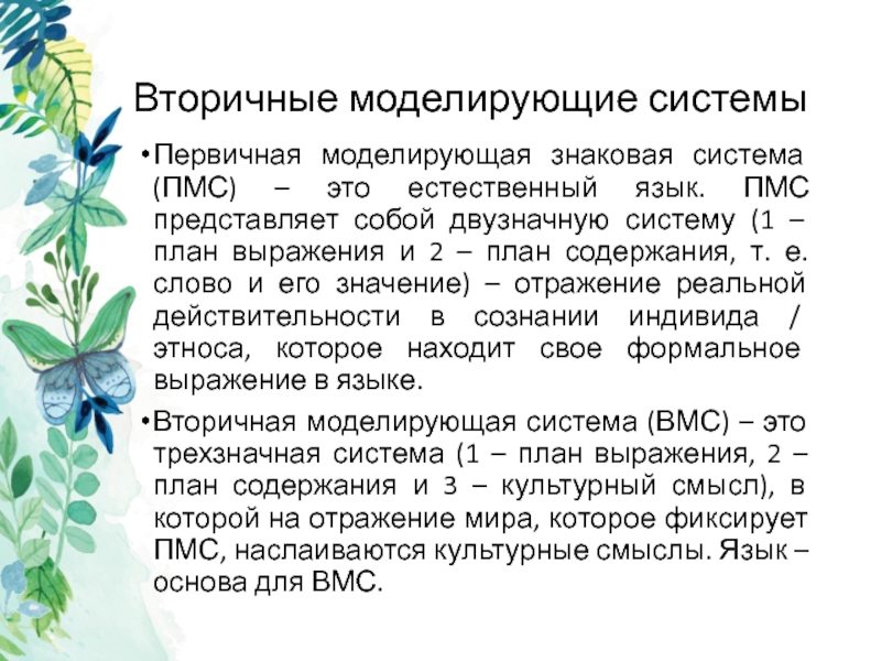 Вторичная моделирующая система (ВМС) – это трехзначная система (1 – план выражения, 2 – план содержания и 3 – культурный смысл), в которой на отражение мира, которое фиксирует ПМС, наслаиваются культурные смыслы. Язык – основа для ВМС.