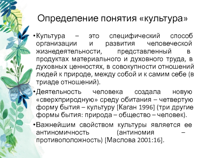 Важнейшим свойством культуры является ее антиномичность (антиномия – противоположность) [Маслова 2001:16].