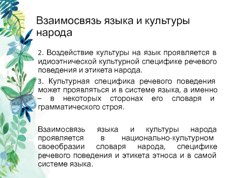 Взаимосвязь языка и культуры народа проявляется в национально-культурном своеобразии словаря народа, специфике речевого поведения и этикета этноса и в самой системе языка.