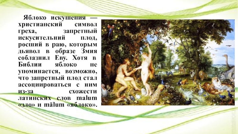 Слайд 3Яблоко искушения — христианский символ греха, запретный искусительний плод, росший