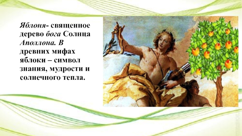 Слайд 4Яблоня- священное дерево бога Солнца Аполлона. В древних мифах яблоки