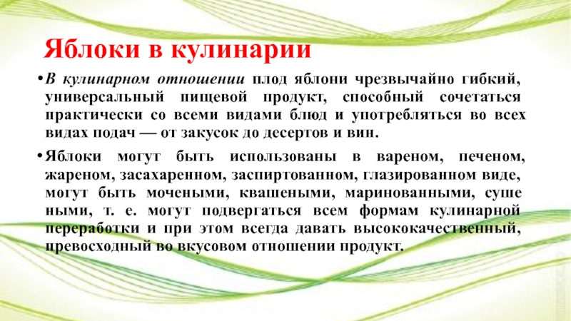 В кулинарном отношении плод яблони чрезвычайно гибкий, универсальный