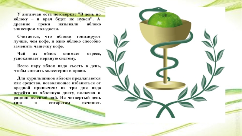 врач будет не нужен". А древние греки называли яблоко эликсиром