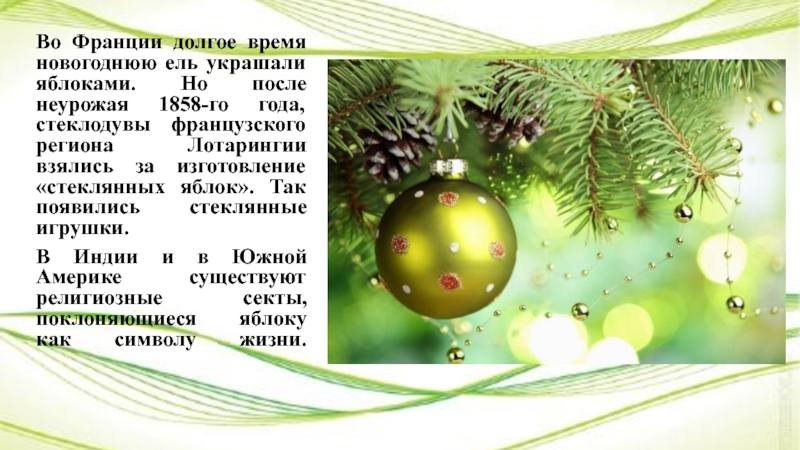 Слайд 7Во Франции долгое время новогоднюю ель украшали яблоками. Но после