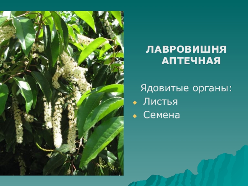 ЛАВРОВИШНЯ АПТЕЧНАЯЯдовитые органы:ЛистьяСемена