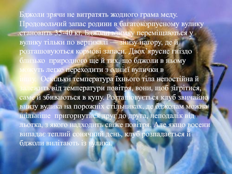 Слайд 13Бджоли зрячи не витратять жодного грама меду. Продовольчий запас родини